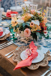 We designed this color injected forrest boho wedding with mis-matched ceremony seating and a variety of soft seating options for the cocktail hour. The reception turned a small barn into a party.