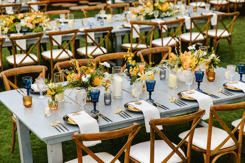 Featured Rentals: Hairpin Chairs, Blue Tumblers, Black Plates and Daycreamer Placemats and Black Urchin Rummers